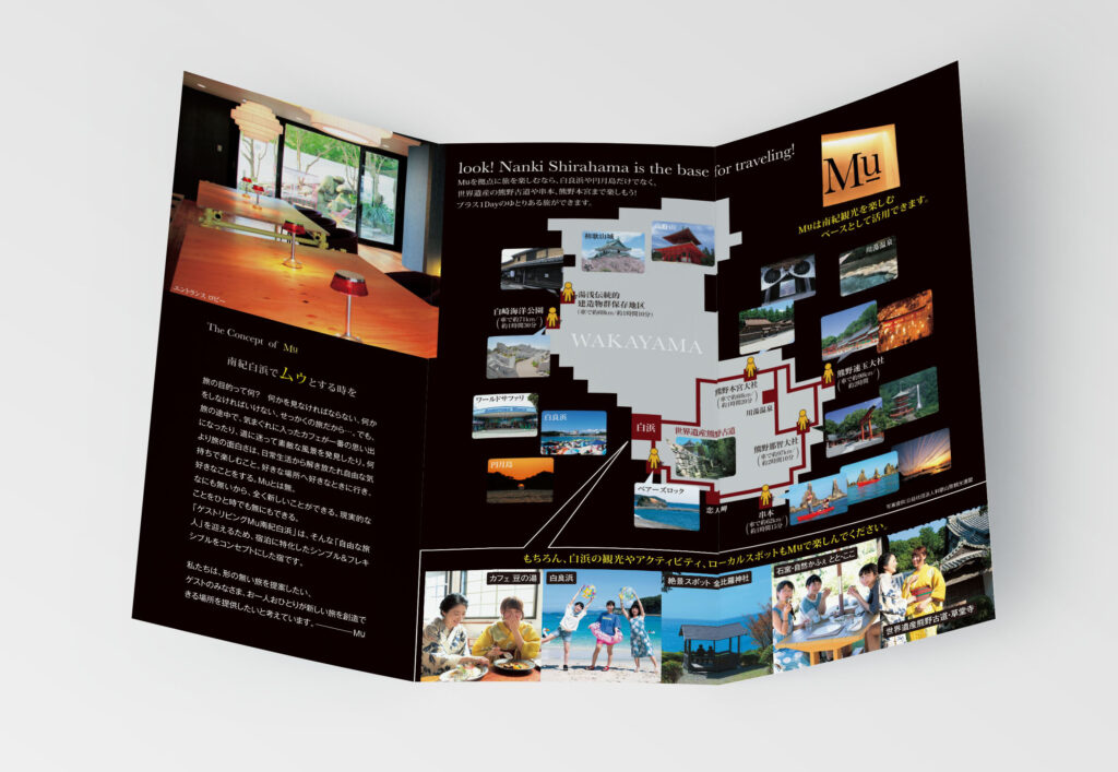 Guest Living Mu Nanki ShirahamaBrochure ゲストリビングMu 南紀白浜A4三つ折りブローシャー 〈企画・制作〉 2021年6月14日 投稿先 PAMPHLET/CATALOG/BOOKLET ゲストリビング Mu 南紀白浜 チラシ・ブローシャー ホテル業 ← 過去の投稿へ 次の投稿へ →