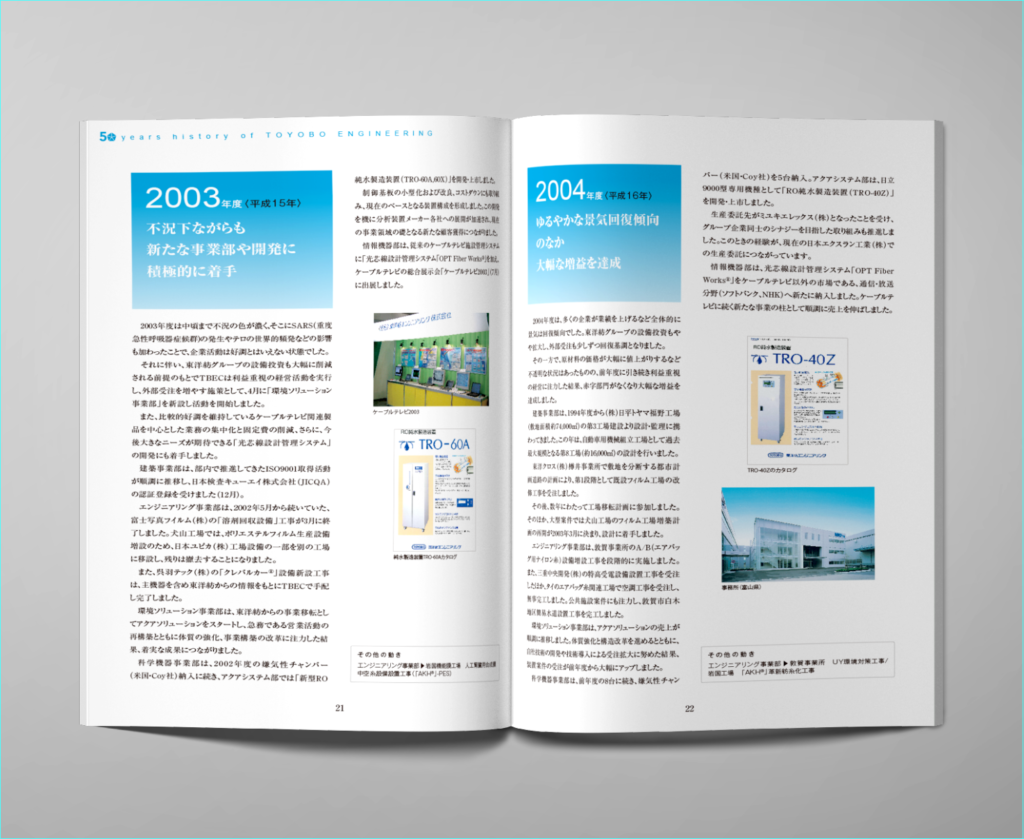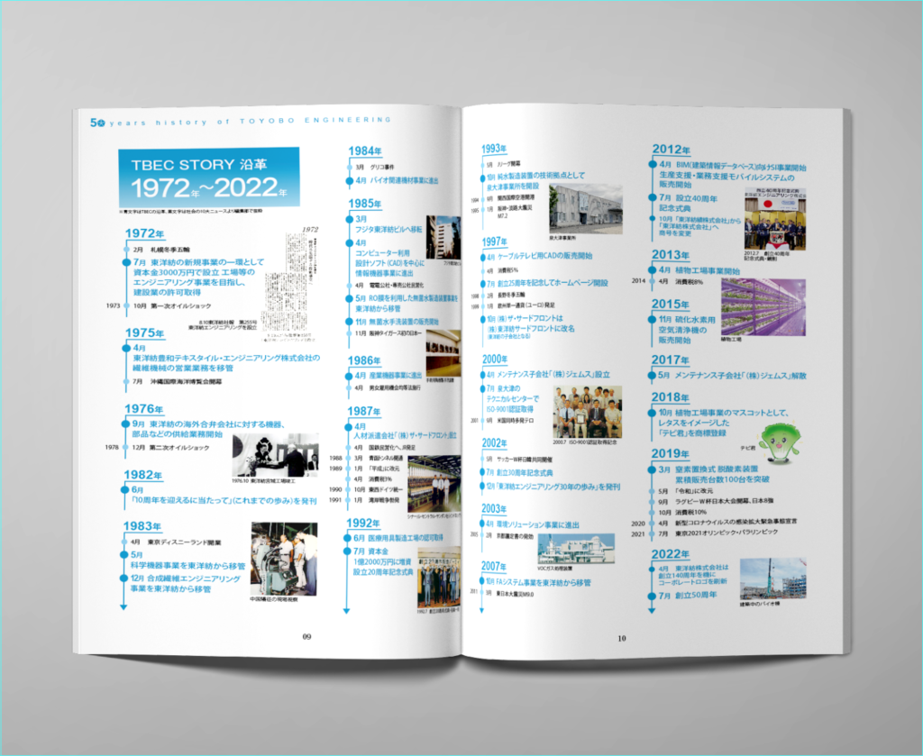 TOYOBO ENGINEERING50th Anniversary Pamphlet 東洋紡エンジニアリング株式会社 50周年史〈制作〉 2023年7月18日 投稿先 PAMPHLET/CATALOG/BOOKLET パンフレット・情報誌 ← 過去の投稿へ 次の投稿へ →